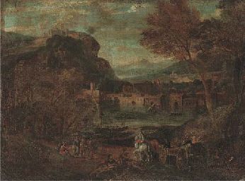 | A wooded river landscape with with travellers on a track, fisherman and classical buildings beyond | |