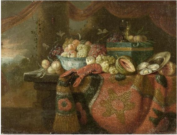 | Still life with fruits, oysters and lobster on a table before a landscape. | |