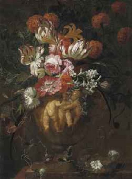 | Roses, tulips and other flowers in a sculpted urn with putti in relief, on a ledge | |