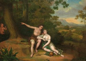 | Allegorical figures resting beneath a tree in a wooded mountain landscape | |