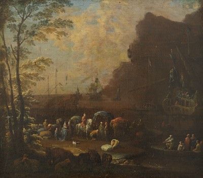 | Figures in Orientalist costume at seaport with anchoring ships, camels and horses, parcels and goods | |