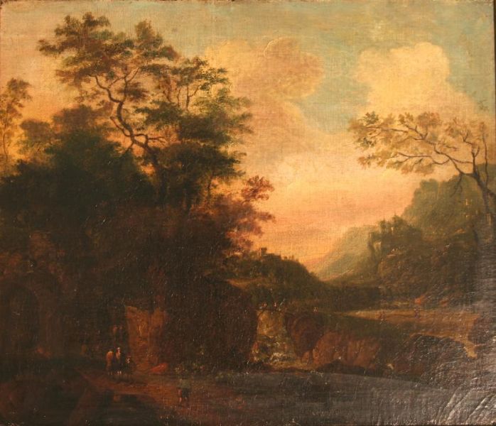 A TRANQUIL WOODED RIVER LANDSCAPE WITH FIGURES