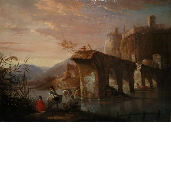 Italian Landscape with Figures before the Ruins of a Roman Bridge