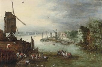 | A river landscape with a ferry crossing near a windmill, a village beyond | |