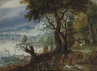 | A wooded river landscape with a hunting party on a track, shipping and villages beyond | |