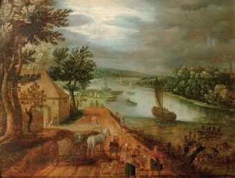 | A wooded river landscape with numerous figures on a path by a cottage | |