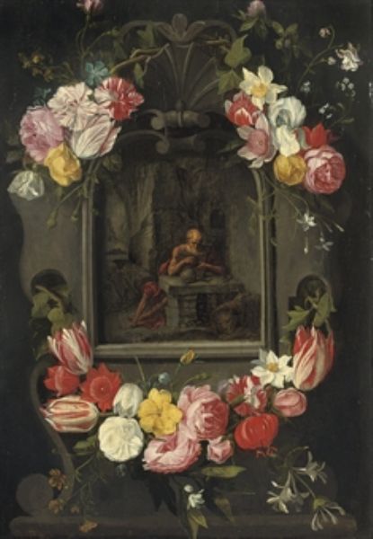 | Swags of mixed flowers framing an image of Saint Jerome | |
