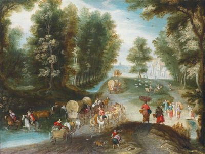 | Travellers in a covered wagon in a wooded landscape near a ford | |