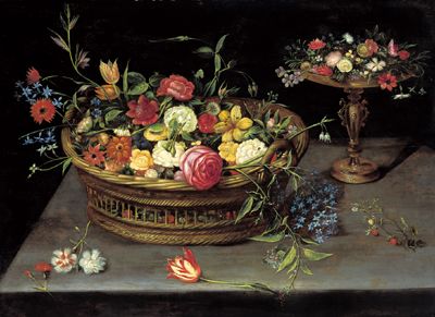 | A basket and a silvergilt tazza with roses, carnations, tulips, peonies, and other blossoms | |
