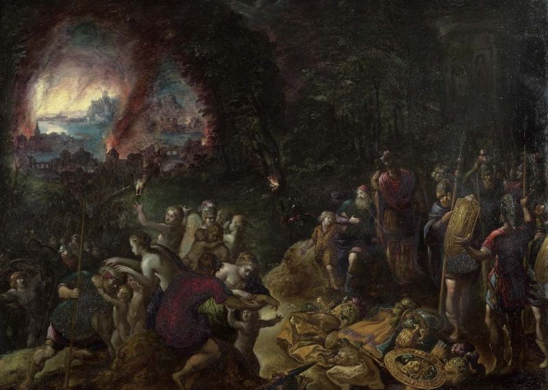 Aeneas flees with Anchises from Troy in flames