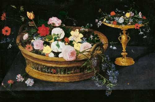 BLUMENKORB UND TAZZA MIT BLUMEN