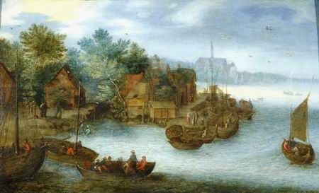 PAYSAGE DE RIVIERE AVEC DES EMBARCATIONS PRES D'UN VILLAGE FLAMAND