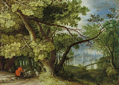 WOODED LANDSCAPE WITH HUNTESMAN, DOGS AND VIEW ON A TOWN