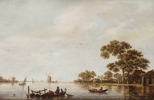 | A river landscape with fishermen in their boats and figures on the shore, shipping beyond | |