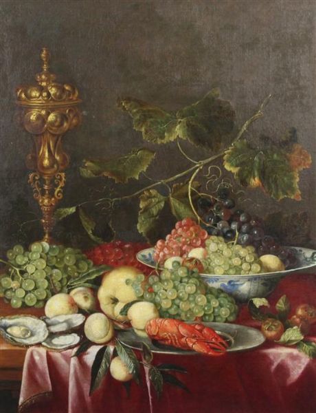 | Still life of fruit, a lobster, oysters and a goblet upon table top | |