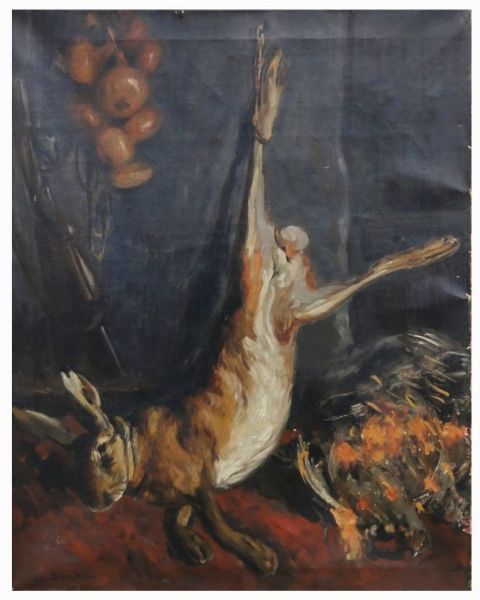 Zátiší s loveckou puškou, zajícem a svazkem cibule