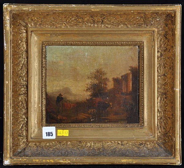 | a herdsman in a pastoral landscape with ruined castle, with inscription ''Both'' verso | |