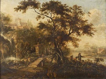 | A WOODED RIVER LANDSCAPE WITH FIGURES AND HILLTOP VILLAGE | |