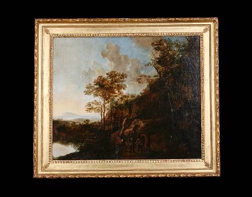 | A wooded river landscape with horsemen on a country path | |