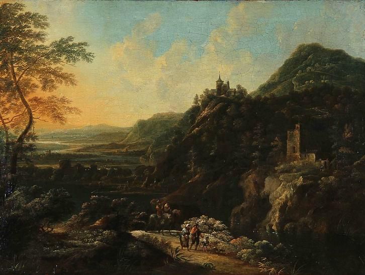 Southern mountain landscape with travelers.