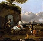 | ITALIANATE LANDSCAPE, WITH CAVALIERS AND THE HORSES BEFORE SOME RUINS | |