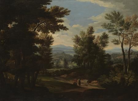 | A WOODED CLASSICAL LANDSCAPE WITH FIGURES ON A PATH | |