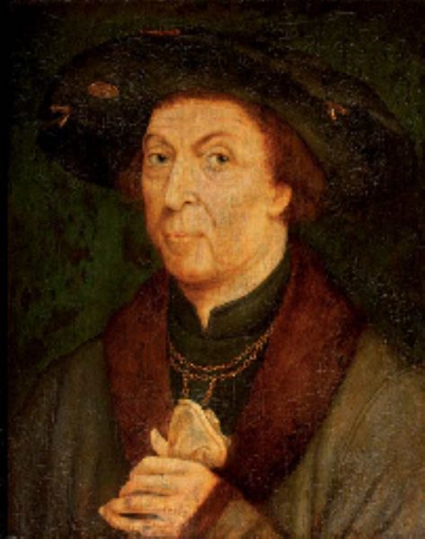 | Portrait of a nobleman, bust-length, in a grey fur-lined coat over a black costume and a black hat with pilgrim signs, holding a | |