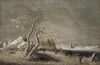 A winter river landscape with figures on a track