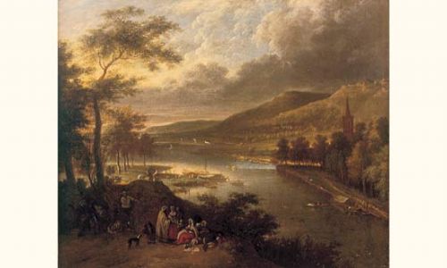 Famille de bohémiens devant un paysage de la vallée du Rhin