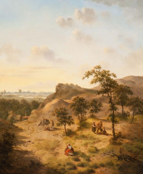 Houtsprokkelaars en landvolk op een beboste heuvel