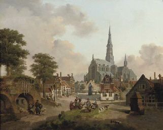 View of a Dutch town with figures playing cards