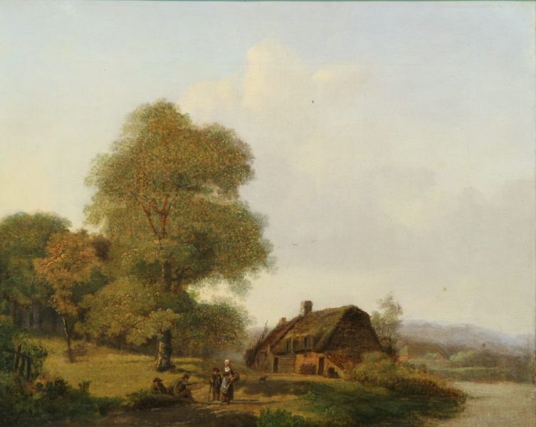 Landschap met rustende figuren bij een huis