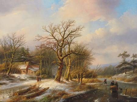 | Romantische Winterlandschaft. Am Waldrand Kate und Holzleser. Figuren auf zugefrorenem Flusslauf. | |