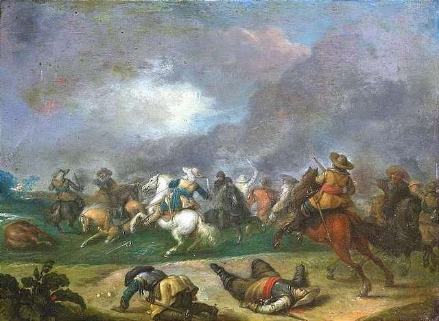 | Reitergefecht zwischen Soldaten mit roten und blauen Feldbinden | |