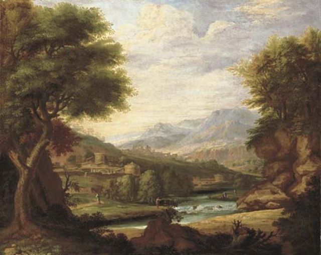 | An extensive classical Italianate landscape with figures by a river, a town beyond | |
