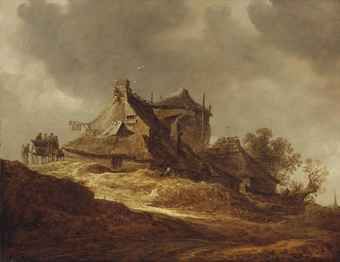 | A dune landscape with travellers near an inn, a church in the distance | |