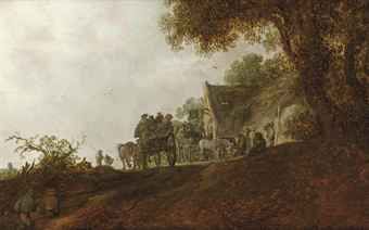 | A landscape with travellers on a road and two carts in front of an inn | |