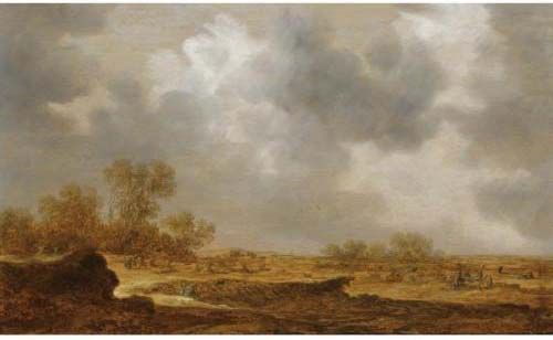 | AN EXTENSIVE DUNE LANDSCAPE WITH A PEASANT WOMAN BAILING HAY AND TWO FARMERS CONVERSING TO THE RIGHT | |