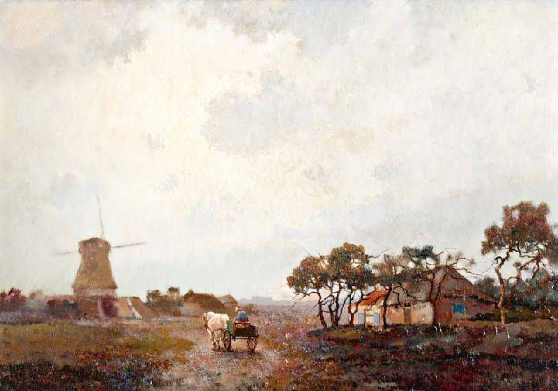 Paard en wagen bij molen aan een heideveld