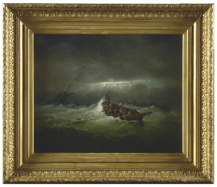Figuren in een sloep bij een zinkend schip