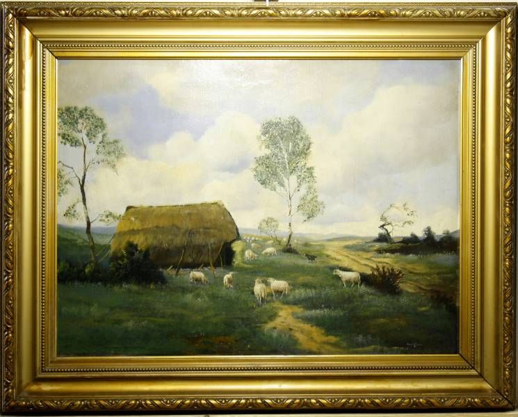 Landschap met schaapskooi en schapen.