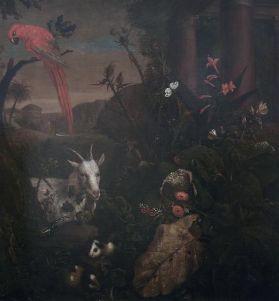 | Italian landscape with thistles, wild flowers, a goat, a parrot, guinea pigs and a hedgehog | |