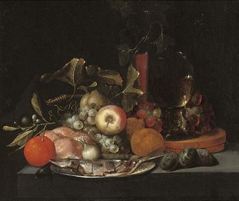 | A herring on a pewter platter with oranges, figs, apples, grapes, a loaf of bread, a façon de Venise glass and a Roemer on a sto | |