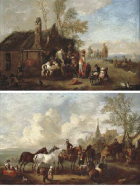 | An extensive landscape with a blacksmith and a farrier and horsemen on a path; and The Horse fair at Valkenburg | |