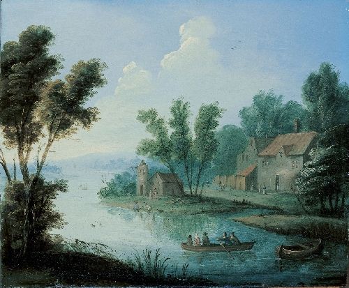 RIVER LANDSCAPE WITH BOAT AND FARMSTEAD