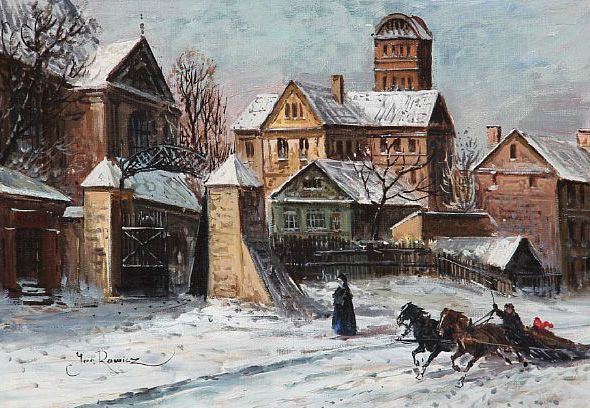 Sledge driving at winter time, presumably in the outskirts of Warsaw