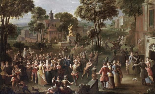 A fête champêtre; and An elegant company at a ball in an Italianate garden