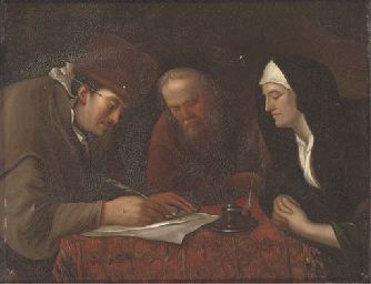 A widow and two gentleman in an interior writing a letter