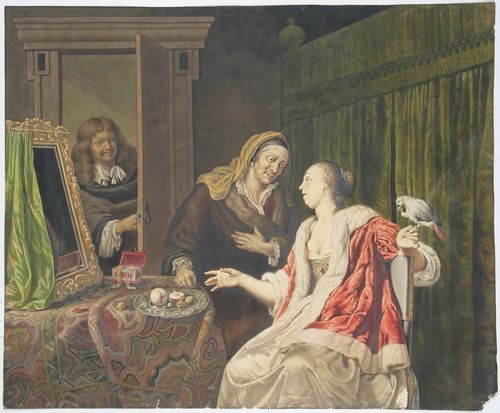 | Elegantly dressed young lady sitting at a table and holding a parrot, an old woman standing beside her and a man entering the ro | |