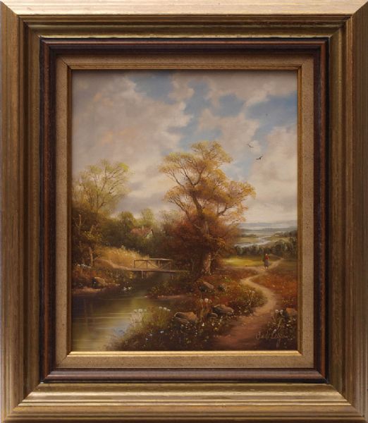 Length, autumnal landscape with lonely farmer's wife on a path by the stream